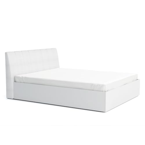 MATERIAL – Korpus: Qualitätsspanplatte, weiß; Front: Qualitätsspanplatte mit Melaminharzbeschichtung, weiß Hochglanz; Bezug Kopfteil: 100% PES; Außenkanten: Antiblockiersystem-Kantenschutz; Türdämpfung: Soft Close System; Schubladen: Soft Close System; Griffe: Griffleiste leer MDF; Beschläge und Scharniere: Metall