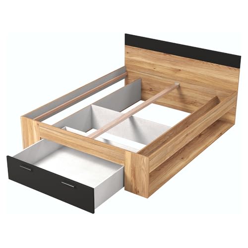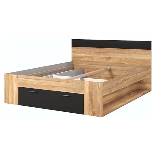 1x Bettgestell mit Liegefläche 160×200 cm, Stützbalken in der Mitte, 2 offene Fächer in den Bettseiten, 1 Bettschublade im Fußteil, B/H/T ca. 166/90/205 cm