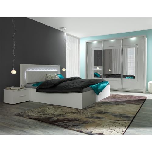 LIEFERUMFANG – Schlafzimmer Set, bestehend alle 1x Schwebetürenschrank mit 2 Schwebetüren (davon 1 mit Spiegel), 1 Kleiderstange, 2 feste Böden, 2 verstellbare Einlegeböden, 4 Schubladen, B/H/T ca. 200/209/61 cm; 2x Nachttisch mit 3 Schubladen, B/H/T ca. 46/56/41 cm; 1x Bettgestell mit Liegefläche 160×200 cm, Stützbalken in der Mitte, 2 offene Fächer in den Bettseiten, 1 Bettschublade im Fußteil, B/H/T ca. 166/90/205 cm