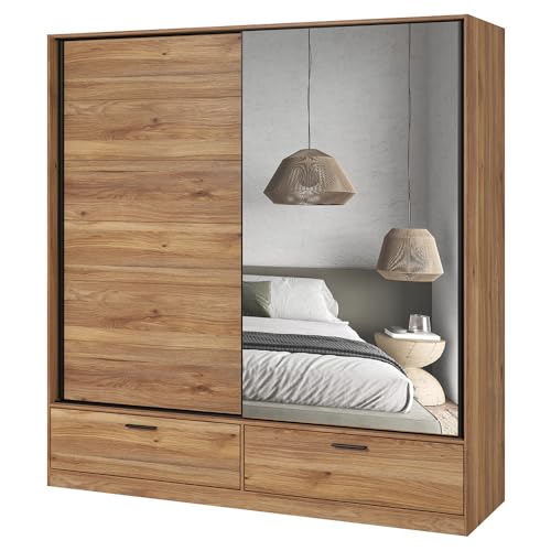 MATERIAL – Front / Korpus: Qualitätsspanplatte, beschichtet; Dekor / Farbe: Mauvella Eiche Nb. / schwarz; Spiegelglas; Griffe: Kunststoff; Schwebetüren: Softclose-Ablichtung; Beschläge: Metall