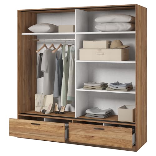 1x Schwebetürenschrank mit 2 Schwebetüren (davon 1 mit Spiegel), 1 Kleiderstange, 2 feste Böden, 2 verstellbare Einlegeböden, 4 Schubladen, B/H/T ca. 200/209/61 cm