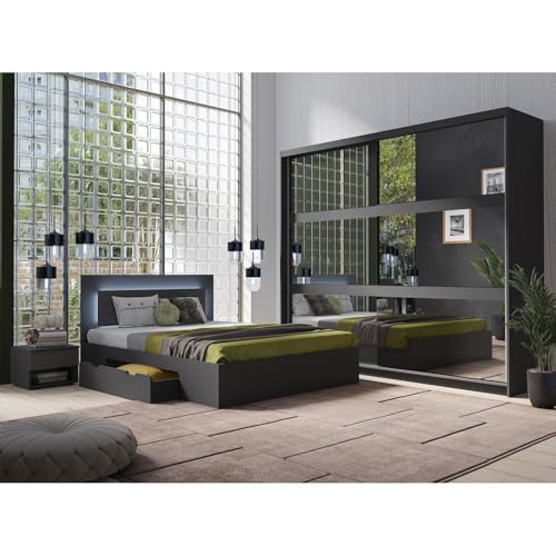 LIEFERUMFANG – 1x Schlafzimmer Set bestehend sämtliche: 1 Doppelbett mit 2 Schubkästen, Liegefläche von 160 x 200 cm, B/H/T: ca. 166/92/218 cm; 2 Nachtschränke mit 3 Schubkästen, B/H/T: ca. 46/56/41 cm; 1 Kommode mit 2 Türen, 2 verstellbaren Einlegeböden, 4 Schubkästen, B/H/T: ca. 132/93/38 cm; 1 Schwebetürenschrank mit 2 Türen mit Softclose-Schaubild, außen mit Spiegel, 5 Einlegeböden, 1 Kleiderstange, B/H/T: ca. 200/210/61 cm