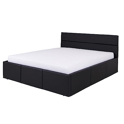 MATERIAL – Korpus: Qualitätsspanplatte mit Melaminharzbeschichtung, Eiche Gold Nb.; Front: Qualitätsspanplatte mit Melaminharzbeschichtung, Eiche Gold Nb.; Bettkorpus: Qualitätsspanplatte mit T25 Schaumstoffpolsterung; Bezug: Kunstleder in schwarz; Griffe: grifflos; Hebevorrichtung: Metall; Beschläge und Scharniere: Metall