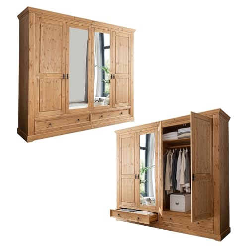 1 Kleiderschrank mit 4 Türen (davon 2 Türen mit Spiegel), 2 verstellbare Einlegeböden, 2 Kleiderstangen, 2 Schubladen, B/H/T ca. 254/215/62 cm