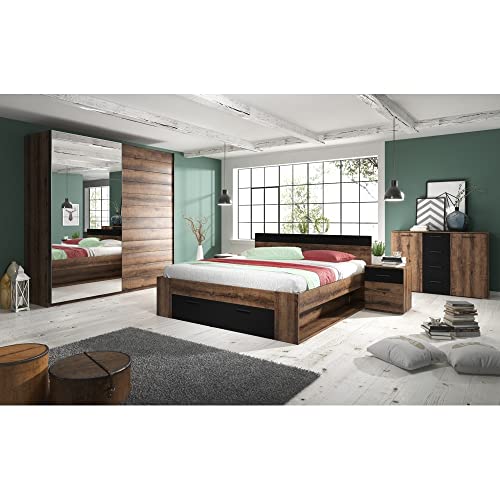 1x Nachttisch mit 1 Schubkasten, B/H/T: ca. 58/45/40 cm, 1x Kleiderschrank mit 2 Drehtüren, 1 Spiegeltür, 2 Schubkästen, 2 Kleiderstangen, 6 Holzböden, B/H/T: ca. 169/201/60 cm
