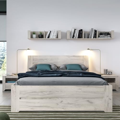 LIEFERUMFANG – 1x Schlafzimmer Set, bestehend leer 1 Wandregal mit 3 Fächern, B/H/T ca. 118,7/21,6/25 cm; 1 Wandregal mit 2 Fächern, B/H/T ca. 84/21,6/25 cm; 2 Nachtschränke mit 1 Schublade, 1 offenes Fach, B/H/T ca. 49,1/37,6/40,2 cm; 1 Bett mit Liegefläche 140×200 cm, höhenverstellbar, mittiger Stützbalken, B/H/T ca. 146,4/91,5/218 cm