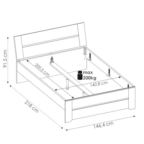 1 Bett mit Liegefläche 140×200 cm, höhenverstellbar, mittiger Stützbalken, B/H/T ca. 146,4/91,5/218 cm