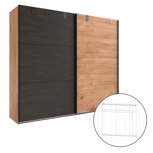 MATERIAL – Material: Qualitätsspanplatte, beschichtet; Dekore: Plankeneiche Nb., Raw Steel Nb.; Kleiderstangen: Metall; Griffe: Metall; Fußgestell: Metall; Schubkästen: per Selbsteinzug; Beschläge ferner Scharniere: Metall