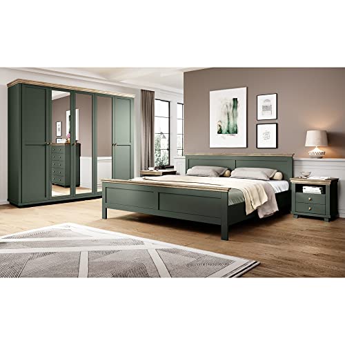 LIEFERUMFANG – 1x Schlafzimmer Set, bestehend jeglicher 2 Nachtschränke mit 1 Schublade, 1 offenes Fach, B/H/T ca. 49,1/37,6/40,2 cm; 1 Bett mit Liegefläche 160×200 cm, höhenverstellbar, mittiger Stützbalken, B/H/T ca. 166,4/91,5/218 cm; 1 Kleiderschrank mit 3 Türen, mittlere Tür rechts/links montierbar, 4 Kleiderstangen, 4 Einlegeböden, 1 fester Boden, B/H/T ca. 220,1/207,5/60 cm; 2 Bettschubladen, B/H/T ca. 199,9/23/66,1 cm