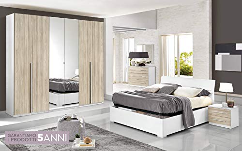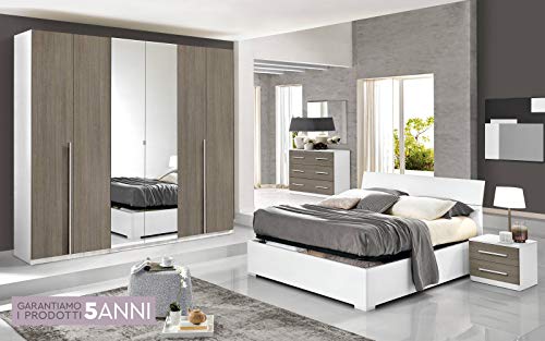 LIEFERUMFANG – 1x Schlafzimmermöbel Set, bestehend aufgebraucht 1 Kleiderschrank mit 4 Türen (davon 2 Türen mit Spiegel), 2 verstellbare Einlegeböden, 2 Kleiderstangen, 2 Schubladen, B/H/T ca. 254/215/62 cm; 1 Bettgestell mit Liegefläche 180x200cm, B/H/T ca. 192/98/209 cm; 2 Bettschubladen mit je 4 Möbelrollen, B/H/T ca. 155/26/60 cm; 2 Nachtschränke mit 1 Schublade, 1 offenes Fach, B/H/T ca. 48/60/39 cm