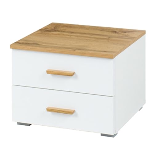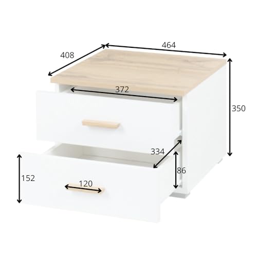 MATERIAL – Korpus / Front: Qualitätsspanplatte mittels Melaminharzbeschichtung; Dekor / Farbe: Wotaneiche Schablone mittels Alpinweiß; Außenkanten: Antiblockiersystem-Kantenschutz; Schubkästen: Soft Close System; Griffe: Holz; Beschläge: Metall