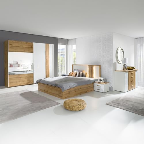 LIEFERUMFANG – 1x Schlafzimmer Set bestehend sämtliche 1 Doppelbett mittels Kopfpolster, 2 schwebenden Nachtschränken mittels je einer Schublade inkl. LED, einem Bettschubkasten je Seite, Liegefläche 180x200cm, B/H/T ca. 289/92/210 cm; 1 Kleiderschrank mittels 2 Schwebetüren, 3 Schubkästen, 1 Kleiderstange, 4 Einlegeböden, verstellbar, Passepartoutrahmen, B/H/T ca. 225/208/65cm; 1 Schubladenkommode mittels 6 Schubkästen, B/H/T ca. 130/83/41 cm