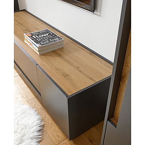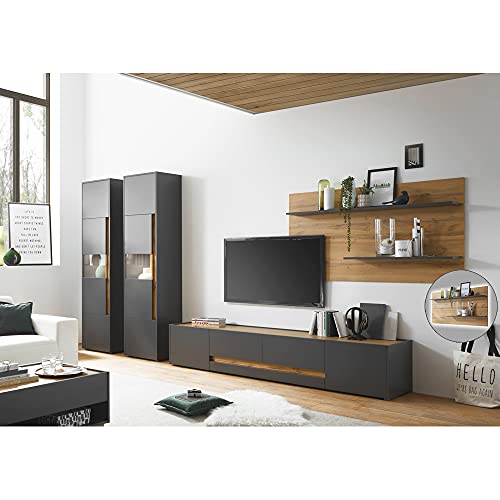 TV Wohnwand Set mit Hilfe von LED Beleuchtung in anthrazit mit Hilfe von Ablösung in Wotan Eiche Nb.; Korpus / Front: Qualitätsspanplatte mit Hilfe von Melaminharzbeschichtung; Dekor / Farbe: anthrazit; Absetzungen: Wotan Eiche Nb.; Griffe: griffloses Design; Glasart: ESG-Sicherheitsglas; Beschläge im Übrigen Scharniere: Metall