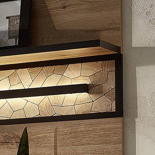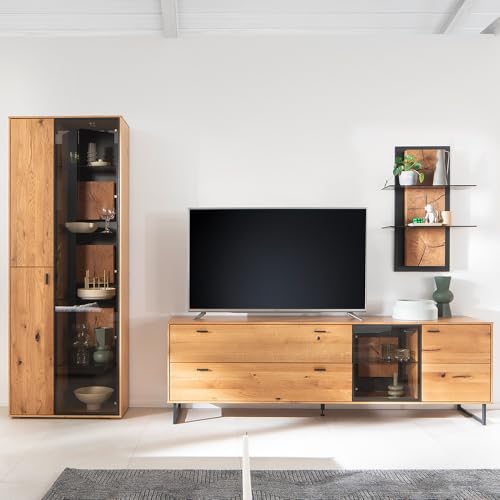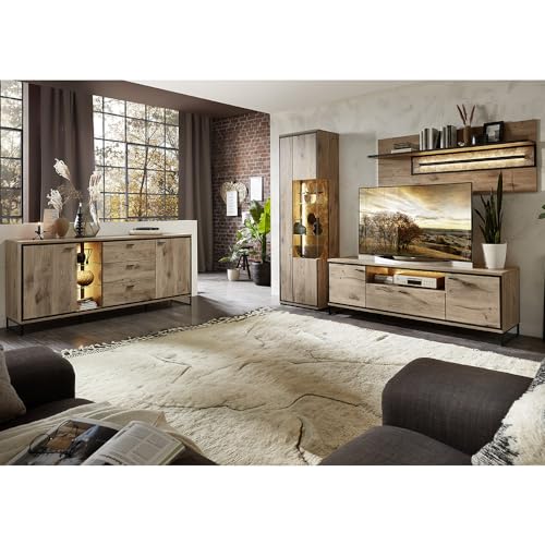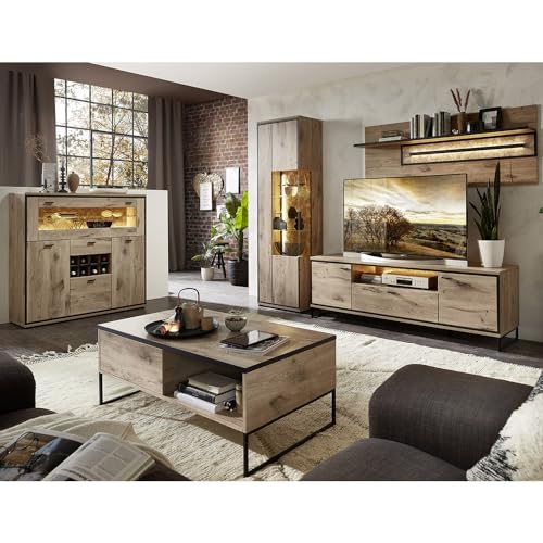 Moderne Wohnzimmermöbel im angesagten Industrial Design. Die Möbel in Eiche Nb. mit schwarz abgesetzten Kanten, schwarzen Metallgriffen und schwarzen Fußgestellen jeder Metall Acht geben einen echten Hingucker.