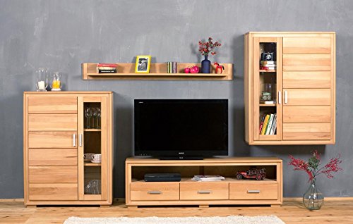 LIEFERUMFANG – 1 Couchtisch mit 1 Schublade, 3 Fächer, ca. 115/45/65 cm; 1 Highboard mit 1 Holztür (innovativ), 1 Tür mit Glaseinsatz (rechts), 7 Holzböden, 1 Glasboden, LED-Beleuchtung, ca. 80/144/40 cm; 1 Highboard mit 1 Klappe, 1 Glasboden, 3 Türen, 7 Holzböden, 1 Schublade, Flascheneinteilung, LED-Beleuchtung, ca. 125/125/40 cm; 1 Lowboard mit 2 Türen, 2 Holzböden, 1 offenes Fach, 1 Schublade, LED-Beleuchtung, ca. 180/61/49 cm; 1 Wandregal mit 4 Fächern, Paneelbeleuchtung, ca. 60/120/20 cm
