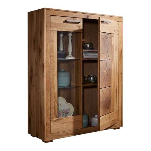 MATERIAL – Material: Wildeiche besonders; Oberfläche: geölt; Korpus & Front mit durchgehender Lamelle; Innenteile keilverzinkt; Absetzungen: Hirnholz; Griffe: Metall, gebürstet; Glasböden: ESG-Sicherheitsglas; Glastüren: Klarglas; Türen: mit Softclose-Darstellung; Beschläge und Scharniere: Metall; Beleuchtung: LED warmweiß, inkl. Touchsensor