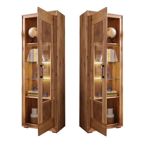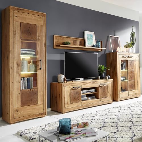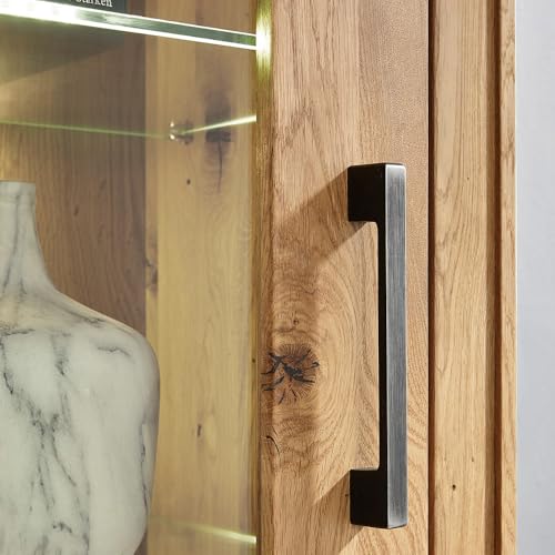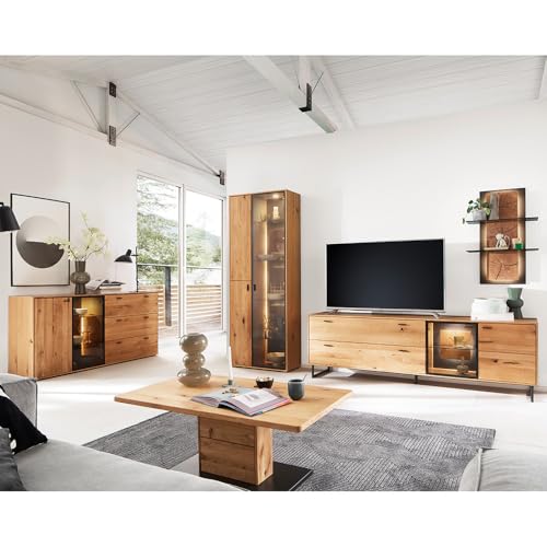 MATERIAL – Material: Wildeiche allerbest; Oberfläche: geölt; Korpus & Front mit durchgehender Lamelle; Innenteile keilverzinkt; Absetzungen: Hirnholz; Griffe: Metall, gebürstet; Glasböden: ESG-Sicherheitsglas; Glastüren: Klarglas; Türen: mit Softclose-Ausbelichtung; Beschläge und Scharniere: Metall; Beleuchtung: LED warmweiß, inkl. Touchsensor