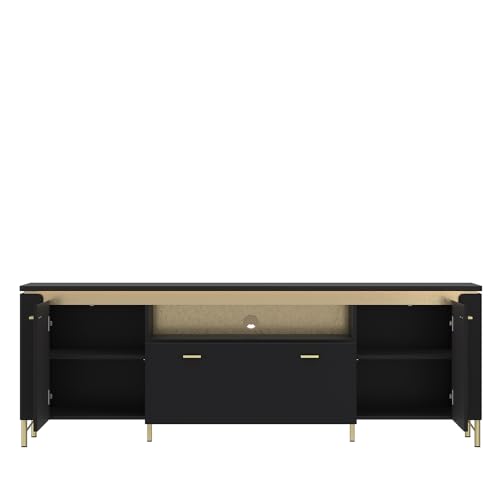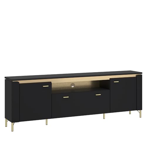 MATERIAL – Material Korpus: Qualitätsspanplatte mithilfe Melaminharzbeschichtung; Material Front: MDF, tiefgezogen; Farbe/Dekor: schwarz matt/goldfarben; Schubkasten: Vollauszug; Türen: Softclose-Bild; Griffe: Metall, goldfarben; Füße: Metall, goldfarben; Schaniere u. a. Beschläge: Metall