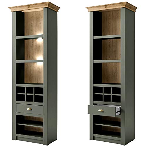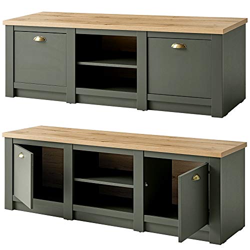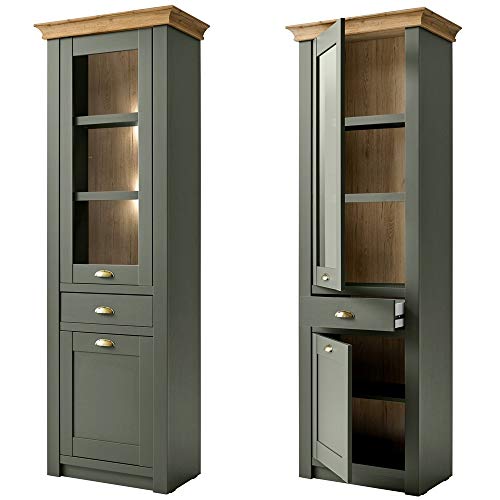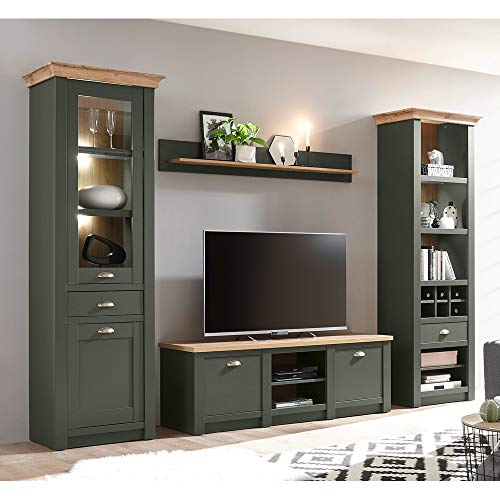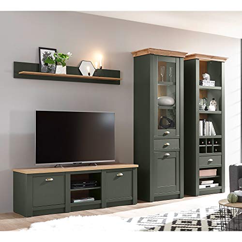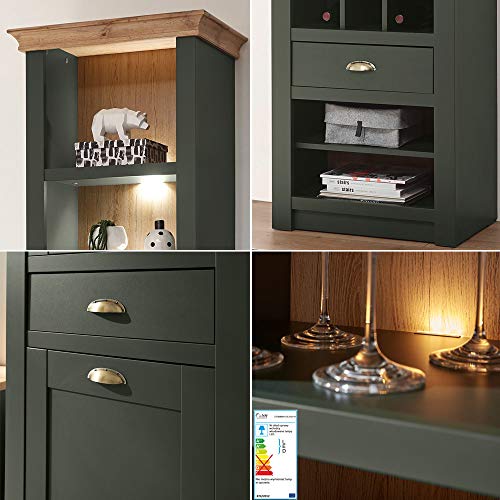 Wohnmöbel im englischen Landhausstil, grün qua Wotan Eiche, Muschelgriffe messingfarben, Metallscharniere des Weiteren -beschläge, LED-Beleuchtung