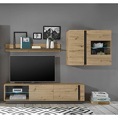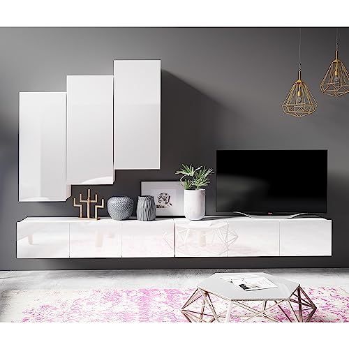 LIEFERUMFANG – 1x Wohnmöbelset, bestehend jeder 2 TV Lowboards mit 3 Türen, 3 Fächer, wahlweise stehend oder hängend montierbar, B/H/T ca. 150/37/43 cm; 3 Hängeschränke mit 1 Tür, rechts/neuartig montierbar, 2 Böden, 3 Fächer, B/H/T ca. 45/117/32 cm; Gesamtmaß B/H/T ca. 300/200/43 cm