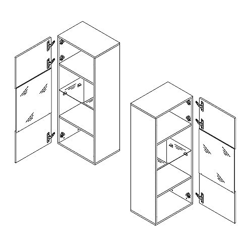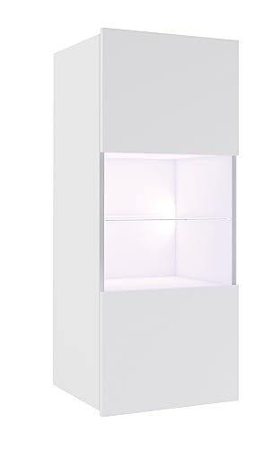 MATERIAL – Korpus: Qualitätsspanplatte mit Melaminharzbeschichtung, weiß; Front: Qualitätsspanplatte mit Melaminharzbeschichtung, weiß Hochglanz; Griffe: grifflos; Glas: ESG-Sicherheitglas; Beschläge und Scharniere: Metall; Beleuchtung: LED, kaltweiß, batteriebetrieben