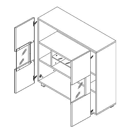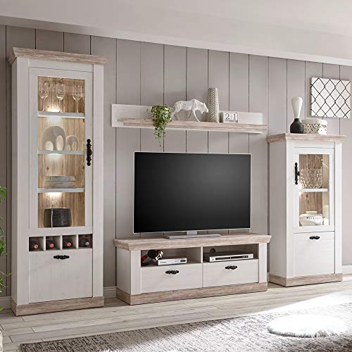 LIEFERUMFANG – 1x Wohnmöbelset, bestehend allesamt 2 Stauraumschränke mit 1 Klappe, wahlweise nach oben oder herunter öffnend, 1 Klappenhalter, 2 Fächer, B/H/T ca. 105/35/32 cm; 2 TV Lowboards mit 3 Türen, 3 Fächer, wahlweise stehend oder hängend montierbar, B/H/T ca. 150/37/43 cm; 2 Hängevitrinen mit 1 Glasrahmentür, rechts/wenn das nicht möglich ist montierbar, 2 Böden, 1 Glasboden, 1 LED Glasbodenbeleuchtung, B/H/T ca. 45/117/32 cm; Gesamtmaß B/H/T ca. 300/200/43 cm