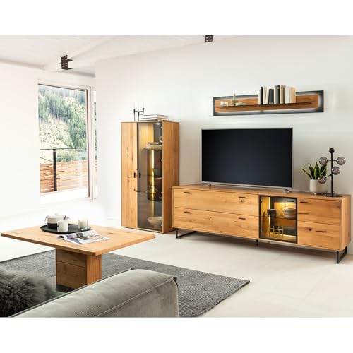 1x Vitrine, gedämpfte Holztür mit Glaseinsatz, Türanschlag rechts, 3 Holzböden, 1 Glasboden, B/H/T: 60/208/37cm; 1x Wandboard, leistungsfähig bis 5 kg, B/H/T: 180/24/22cm