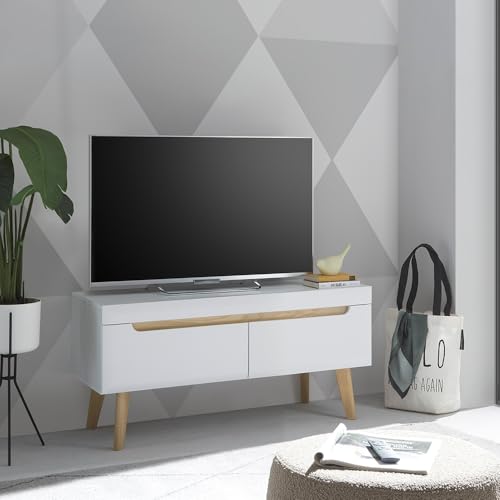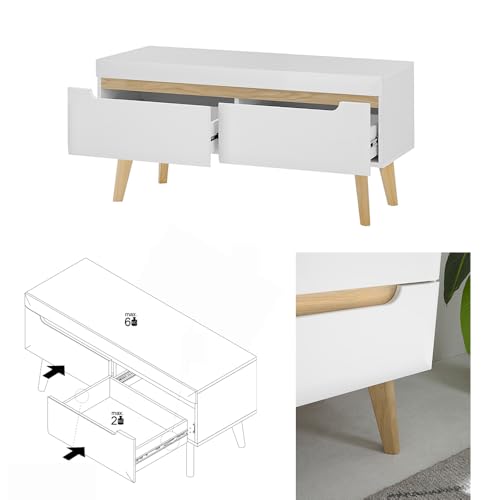 1 TV-Lowboard mithilfe 2 Schubkästen (max. Belastbarkeit ca. 2 kg), Deckblech, max. Belastbarkeit ca. 6 kg, B/H/T: ca. 107/50/40 cm