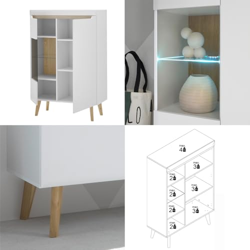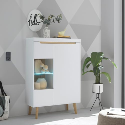 MATERIAL – Korpus: Qualitätsspanplatte mithilfe Melaminharzbeschichtung; Front: MDF, tiefgezogen; Farbe / Dekor: Weiß Matt / Scandi Eiche Nb.; Griffe: Griffmulde; Füße: Holz, ca. 20 cm hoch; Beleuchtung: LED-Glaskantenbeleuchtung; Beschläge des Weiteren Scharniere: Metall