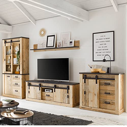 Moderne Wohnzimmermöbel in Wotan Eiche Nb. unter Einsatz von Glaselementen, schwarzen Griffen und Füßen aufgebraucht Metall
