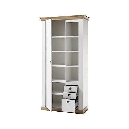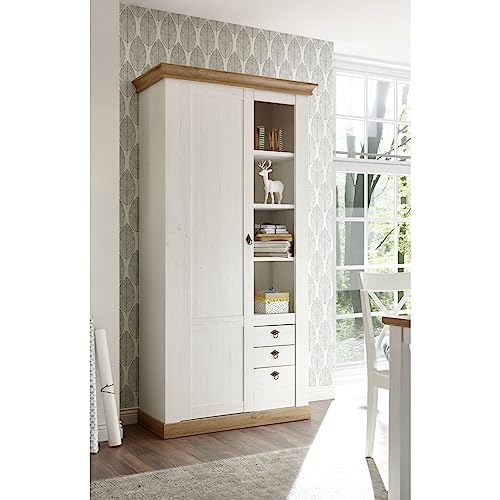 Möbel im Landhaus Design, Griffe rautenförmig, silberfarben, Pinie weiß & Wotan Eiche, LED-Rückwandbeleuchtung, Gesamtmaß B/H/T ca.: 386/204/52cm