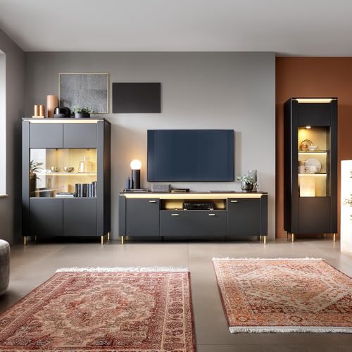 LIEFERUMFANG – Wohnwand, bestehend sämtliche 1x Lowboard mit 2 offenen Fächern, Rückwand mit Kabeldurchlässen, 1 Schublade, B/H/T ca. 125/43/46 cm; 1x Highboard mit 1 Glasrahmentür, 2 feste Böden, 3 Einlegeböden, 1 Glasboden, LED-Glaskantenbeleuchtung, B/H/T ca. 98/145/40 cm