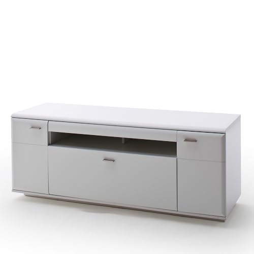 1x Lowboard mit 2 Türen, 2 Einlegeböden, 1 Schubkästen, 2 offenen Fächern, jeweils mit 1 Kabeldurchlass, Deckblech max. stabil bis 30 kg, B/H/T: ca. 150/60/51 cm