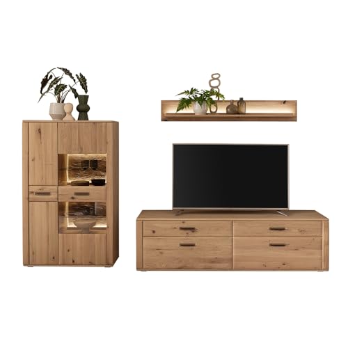LIEFERUMFANG – Wohnzimmer Set bestehend die Gesamtheit: 1x Vitrine mit LED-Beleuchtung, B/H/T: ca. 60/208/38 cm; 1x Lowboard mit Kabeldurchlass, Deckblech max. stabil bis 30 kg, B/H/T: ca. 150/60/51 cm; 1x Wandboard mit LED-Beleuchtung, B/H/T: ca. 150/22/22 cm; 1x Highboard mit LED-Beleuchtung, Deckblech max. stabil bis 30 kg, B/H/T: ca. 90/124/38 cm; 1x Couchtisch mit Rollen, B/H/T: ca. 115/44/70 cm
