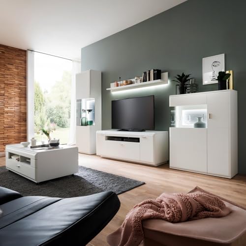 Wohnwand im modernen Stil in edlem, matten Weiß, aufgebaute Ablieferung, hochwertiges MDF mit einer strapazierfähigen Beschichtung, Metallgriffe, LED Beleuchtung