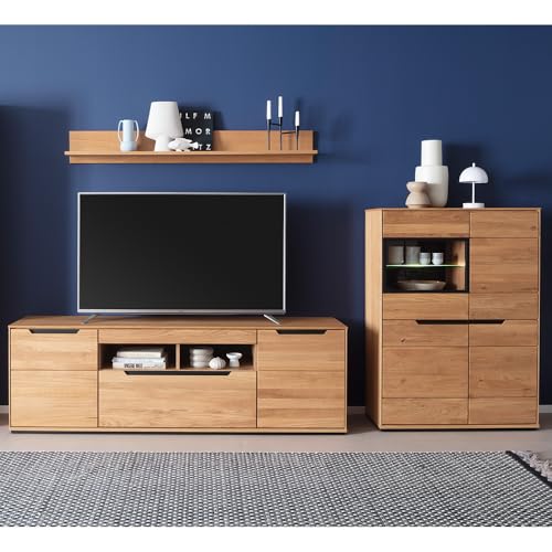 LIEFERUMFANG – 1x Wohnwand, bestehend ganz 1 Wandboard, B/H/T ca. 150/22/22 cm; 1 Lowboard mit 1 Klappe mit Glas, 1 Schublade, 1 Tür, 1 Einlegeboden, B/H/T ca. 214/63/50 cm