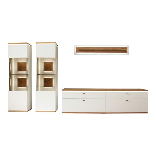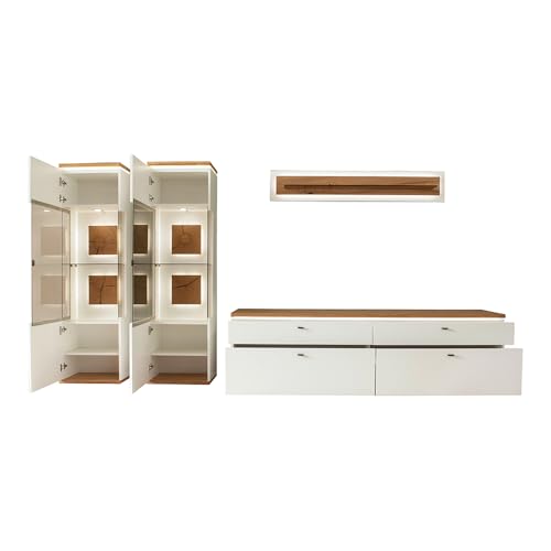 Entdecke Eleganz und Komfort mit unserer Möbelkollektion für dein Wohnzimmer in weiß mit Eiche Nb., veredelt mit einzigartigen Applikationen sämtliche massivem und geöltem Hirnholz in Wildeiche und ausgestattet mit Softclose-Türen und -Schubladen.