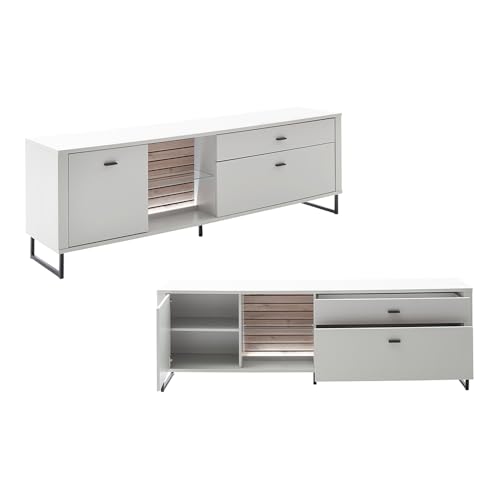 1 Lowboard mit 1 Tür, 1 verstellbarer Einlegeboden, 2 offene Fächer, 2 Schubladen, 1 LED-Band 50cm, B/H/T ca. 210/69/44 cm