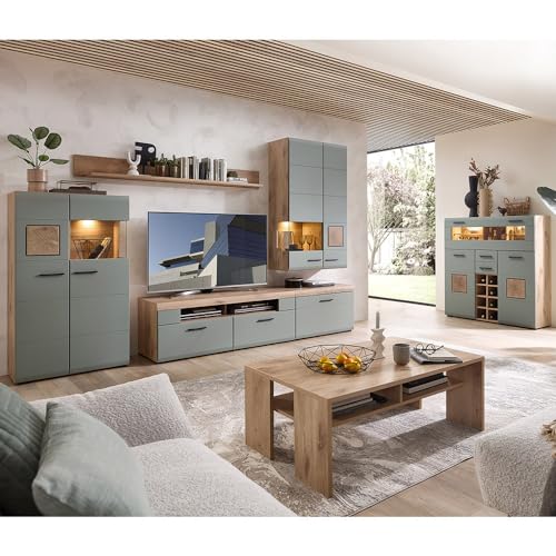 LIEFERUMFANG – 1x Wohnwand, bestehend jeglicher 1 Vitrine mit 2 Türen mit Glaseinsatz, 8 innenliegende Fächer, B/H/T ca. 100/185/37 cm; 1 Wandboard, B/H/T ca. 150/19/20 cm; 1 Lowboard mit 1 Tür, 1 verstellbarer Einlegeboden, 2 offene Fächer, 2 Schubladen, B/H/T ca. 210/69/44 cm; 1 Couchtisch, B/H/T ca. 100/46/60 cm
