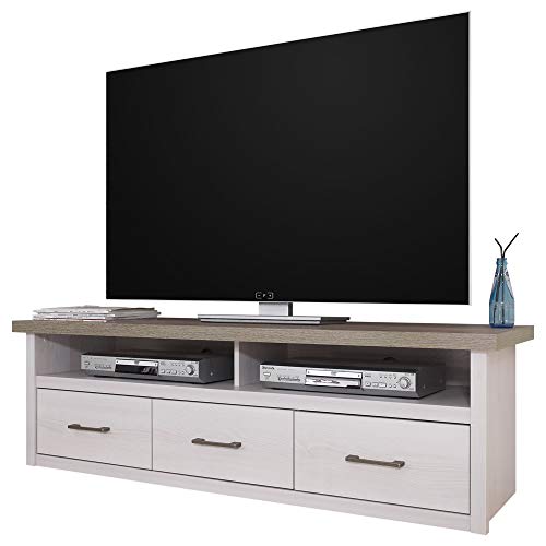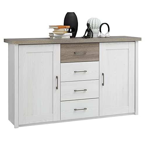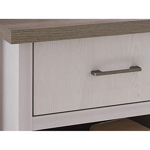 Wohnwand Wohnzimmer im Landhausstil in Pinie weiß Nb./Trüffel Eiche Nb.; Materialdaten | Oberflächen: Korpus/Front: Qualitätsspanplatte mit Melaminharzbeschichtung, Pinie weiß Nb., Dekor/Absetzungen: Pinie weiß Nb. mit Trüffel Eiche Nb., Oberfläche: 3D-Touchwood-Struktur, Beschläge und Scharniere: Metall