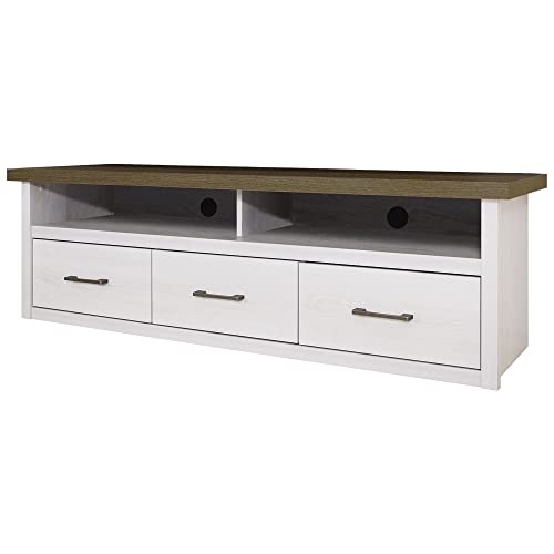 1 Lowboard mit 2 offenen Gerätefächern mit je 1 Kabeldurchlass, 3 Schubkästen, Artikelgewicht: ca. 41 kg, B/H/T: ca. 148/46/43 cm