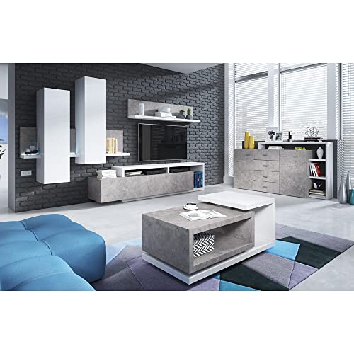 Türen: Soft-Close-Darstellung, Griffe: Metall, altsilber; Lieferumfang | Produktinformation | Maßangaben: 1x Wohnwand Wohnzimmer bestehend alle: 2x Standregal mit je 2 Holzböden, 1 Schubkasten, 1 Tür, dahinter 1 Holzboden, Artikelgewicht ca. 46 kg, B/H/T: ca. 60/201/43 cm, 1 Lowboard mit 2 offenen Gerätefächern mit je 1 Kabeldurchlass, 3 Schubkästen, Artikelgewicht: ca. 41 kg, B/H/T: ca. 148/46/43 cm