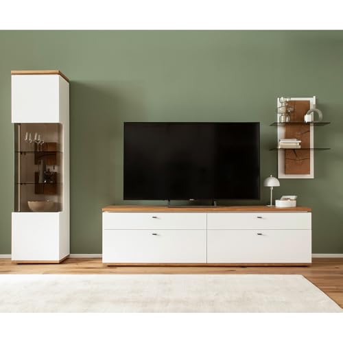 LIEFERUMFANG – 1x Wohnwand, bestehend allesamt 1 Vitrine mit 1 Tür mit Türanschlag modern, 4 Glasböden, 1 Rückwandbeleuchtung 4er Set, ca. 45cm lang, B/H/T ca. 52/190/37 cm; 1 Lowboard mit 2 Doppelschubladen, 1 Tür, 1 Holzboden, für TV bis ca. 80 Steuer im Rahmen, B/H/T ca. 209/68/50 cm