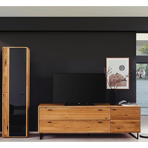Elegante Möbel für dein Wohn- und Esszimmer – Massive Wildeiche mit geölter Oberfläche, anthrazitfarbene Metallfüße und -griffe und anthrazitfarbene Rahmentüren mit Glaseinsatz.