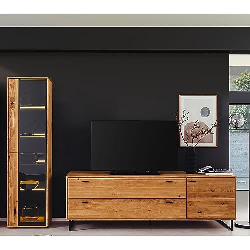 MATERIAL – Material Front: Wildeiche außerordentlich geölt mit durchgehender Lamelle; Glasrahmen: Leichtmetall anthrazit lackiert; Glas: Venusglas anthrazit; Material Korpus: Qualitätsspanplatte, Wildeiche furniert, geölt; Farbe Rückwand: anthrazit; Griffe: Metall, anthrazit; Fußgestell: Metall, anthrazit; Türen: gedämpft; Schubladen: Unterflurauszüge, gedämpft; Beschläge und Scharniere: Metall; Beleuchtung: LED, inkl. Trafo, Schalter, Zuleitung und Schuko-Stecker