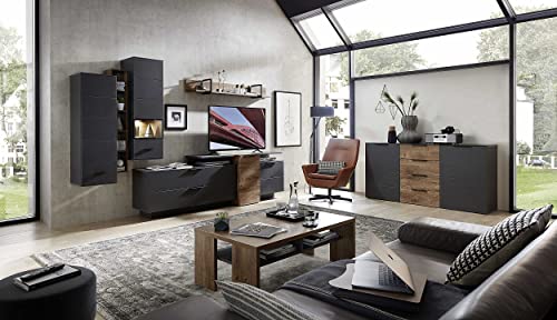 Elegante Möbel für dein Wohn- und Esszimmer in trendiger, massiver Wildeiche in Kombination mit anthrazitfarbenen Elementen.