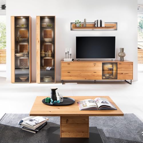 MATERIAL – Front: Wildeiche sonderlich geölt; Glasrahmen: Alu anthrazit; Glas: Venusglas anthrazit; Korpus: Qualitätsspanplatte, Wildeiche furniert; Farbe Rückwand: anthrazit; Wandboard: hinteres Paneel Qualitätsspanplatte, anthrazit / vorderes Paneel & Boden Wildeiche sonderlich geölt; Tischplatte Couchtisch: Qualitätsspanplatte, Wildeiche furniert; Griffe & Fußgestell: Metall, anthrazit; Türen: gedämpft; Schubladen: Unterflurauszüge, gedämpft; Beleuchtung: LED, inkl. Trafo, Schalter, Zuleitung