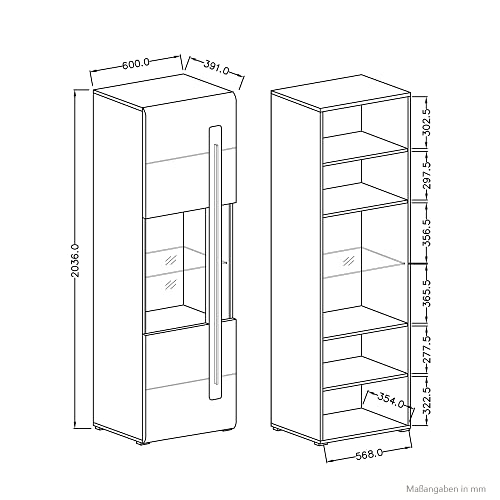 Wohnzimmermöbel Set: 1 Vitrine mit 1 Tür (li/re montierbar), 2 festen Böden, 2 Einlegeböden, 1 Glaseinlegeboden, 1 LED Unterbauspot, B/H/T: ca. 60/204/39 cm; 1 Wandregal mit 1 Ablageboden, max. Belastbarkeit 3 kg, B/H/T: ca. 160/22/23 cm; 1 Lowboard mit 2 offenen Fächern mit Kabeldurchlass, 2 LED Unterbauspots, 1 Schubkasten (innen eingeteilt in 2 einzelne Fächer), maximale Belastbarkeit Abdeckplatte 40 kg, Schubkastenfächer jeweils 7 kg, B/H/T: ca. 140/52/50 cm