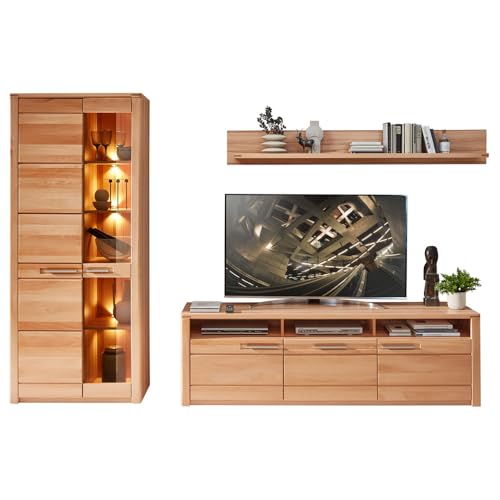 LIEFERUMFANG – Wohnzimmer Set bestehend alle: 1x Kommode mit 3 Schubkästen, 2 Türen, B/H/T ca. 135/86,5/40,6 cm; 1x Vitrine mit 2 Türen, Glastür mit Push-to-open Illustration, 1 Schubkasten, B/H/T ca. 54,5/196,1/40,6 cm; 1x Wandboard, B/H/T ca. 120/32/18 cm; 1x TV Lowboard mit 2 Türen,1 offenem Fach, 1 Schubkasten, B/H/T ca. 135/56,1/40,6 cm; 1x Highboard Vitrine mit 2 Türen, 1 LED Beleuchtung, B/H/T ca. 104,8/150/40,5 cm; 1x Couchtisch mit 3 offenen Fächern, 1 Schubkasten, B/H/T ca. 90/45,5/58 cm