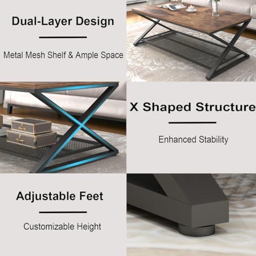 【Haltbarkeit】Unser couchtisch rechteckig mit Netzablage bietet dank der X-förmigen Metallstütze, dem stabilen couchtisch metall Rahmen und verstellbaren Füßen außergewöhnliche Standfestigkeit. Diese stabile Konstruktion verhindert Kippen, Wackeln und schützt den Boden – ideal wie wohnzimmertisch, couch beistelltisch und vintage möbel An Stelle jedes wohnzimmer möbel oder retro möbel-Ambiance.